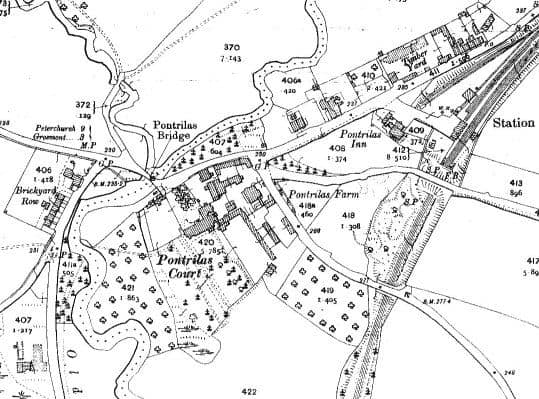 The 1904 Ordnance Survey map showed areas of marshland to the south, with both deciduous and coniferous wooded areas to the west of Pontrilas Court.